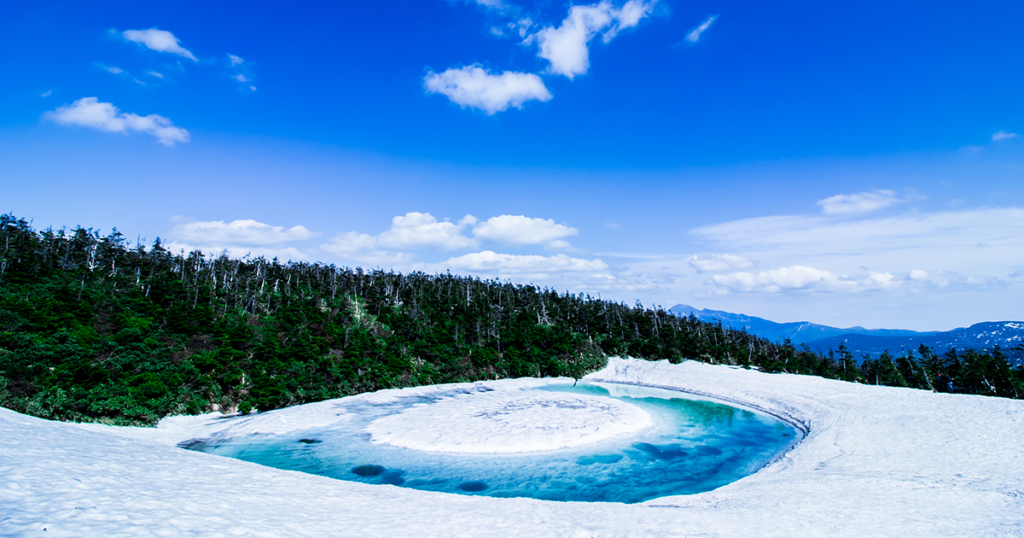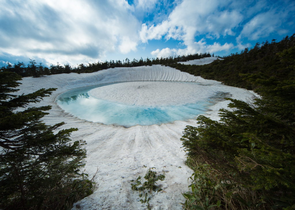 “ドラゴンアイ”(Dragon Eye)这个别名,是因为在冬季到春季融雪期间,湖面上形成了一个独特的冰层图案,看起来就像龙的眼睛。这是一个非常罕见的自然现象,吸引了许多摄影师和游客前来拍照和观赏。 这个湖泊位于八幡平的高海拔地区,周围环绕着美丽的自然风光,可以进行徒步旅行和露营。然而,由于其位置偏僻,前往这里需要一定的准备和规划。总的来说,鏡沼(八幡平ドラゴンアイ)是一处提供独特自然景观和户外活动的地方。