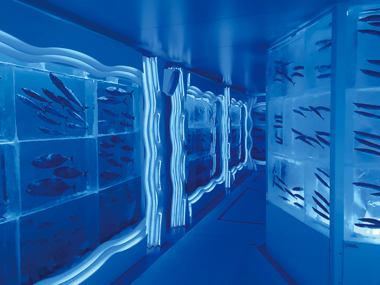这个水族馆特别之处在于,展示的海洋生物都被冷冻在透明的冰块中。在这个冷冻水族馆,游客可以欣赏到各种各样的海洋生物,包括各种鱼类、贝类和甲壳类动物等。这些生物都被冻在冰块中,如同被永久保存下来的瞬间,让人可以从不同的角度近距离观察它们。此外,氷の水族館的内部温度被保持在零下20度,以确保冰块不会融化。因此,来访的游客需要穿着足够保暖的衣物。